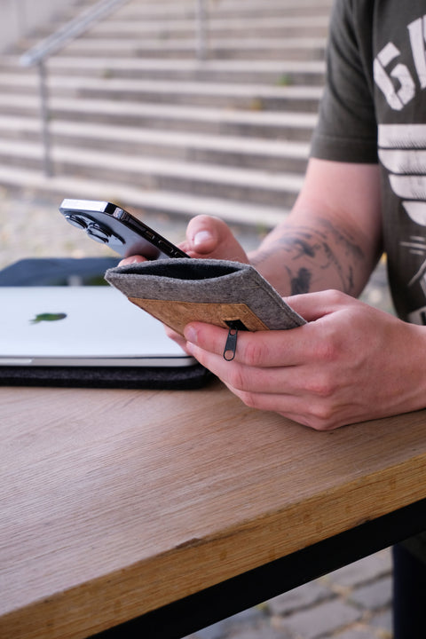 Our bags and covers are mostly made of felt, cotton and cork fabric. These materials are largely plastic-free and biodegradable. Their origins are fair and socially acceptable. Production takes place in our own workshop.