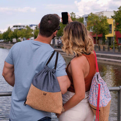 - The bottom is made of water- and dirt-repellent cork fabric, with a large compartment for keys, cell phone or wallet. Worn on your back, the compartment with your valuables is well protected.