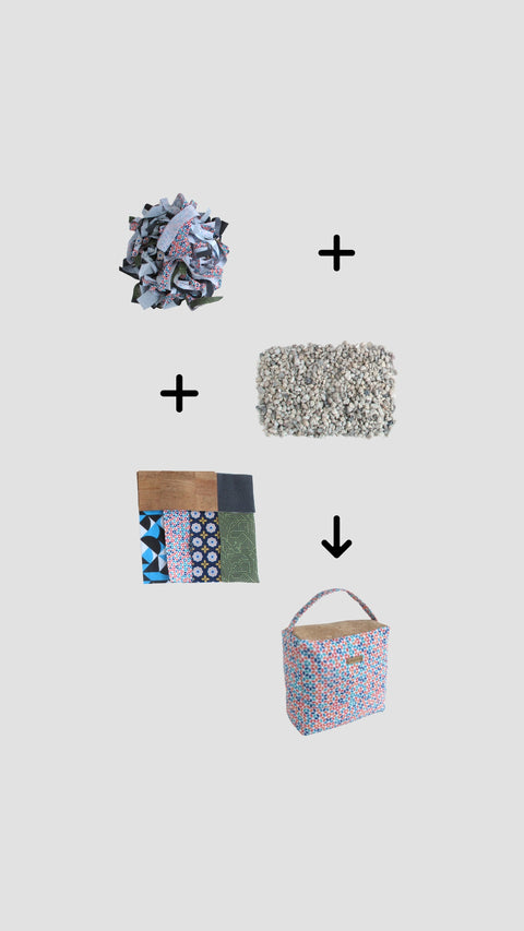 Here you can see at a glance how our sustainable Smukbird doorstop is made. At the top left there are colorful fabric and felt leftovers from our production, which we use as filling material. To the right of it you will find various leftover materials and a cork element, which will later form the outer shell. At the bottom left you can see river pebbles from the Rhine - they give the doorstop its weight. And finally, the finished doorstop is presented at the bottom right - a unique, handmade piece made from materials that would otherwise have remained unused. This picture shows you directly how we at Smukbird work to conserve resources and reuse waste sensibly.